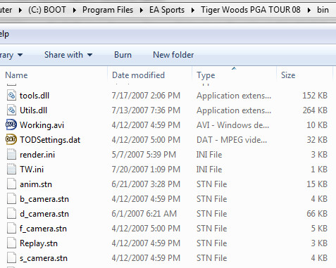 Thanks! Yes, I should've actually ~looked~ at the TV TOWER TEE BOX view first before editing the camera. I assumed from the name it was a view from the tee but it seems to have been from the green. As for the file locations, thanks but maybe I wasn't clear what I wanted. What I want is the file(s) where the game stores the newly edited camera view. I brought up the bin folder, as you can see in the attached file, and none of the .stn files have a modified date past 2007. In fact they are identical to the ones in the bin of an older game installation. So maybe the game's ~not~ storing the new camera views there? |