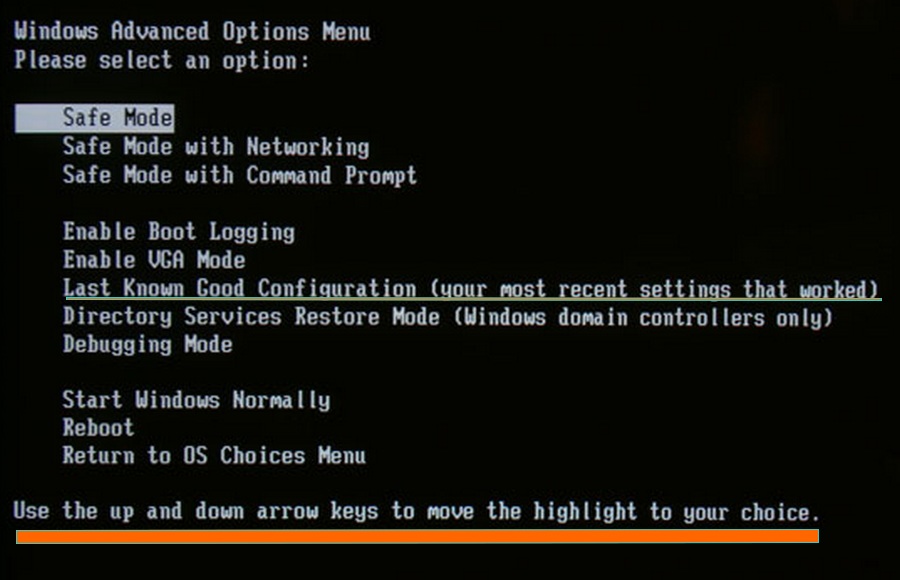 You'll get a screen like this below (without my added colored lines). You won't have a mouse at this point, so use the UP/DOWN arrow keys to select what you want. The first thing to try is "Last Known Good".