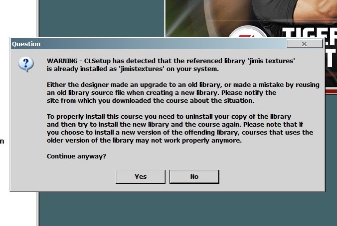 Thank you for the explanation Gunpower61. I had Jimistextures (2006) already installed, but the course would not load. I got the TW 07 black window error that it cant find the course, so try another one. Since CLsetup would not install both, I created a Jimis textures(2007) folder in the libraries directory and used the TW 07 Course Utilities to install Jimis textures(2007) in that folder, so both libraries are now installed. Now the course loads and plays fine. I will remember that solution. I have encountered the problem before. Thanks again. You guys are all great with the way you help others.