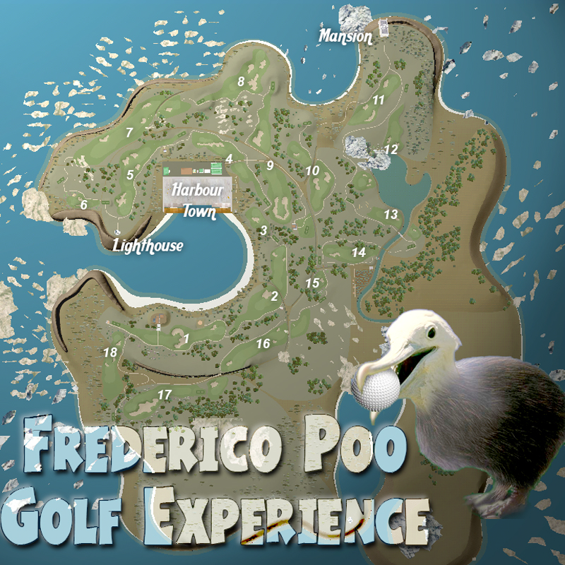 When the European powers started scrambling for empire in the 18th century, the then head of state of Jimiland, Lord Cecil XII Blabbermouth, felt he couldnt be left behind. The main problem was that by the time he had convinced his subjects that this was good idea, most of the world had been carved up already by the great powers. Even the King of Belgium had managed to obtain his piece of the pie. One little spot on the globe remained, however: The tiny tropical island of Frederico Poo, actually the summit of an undersea mountain thats part of the Mid-Atlantic Ridge, where East and West get pushed ever further apart due to relentless plate textonics. Frederico Poo, named after the intrepid Spanish seaferer who stumbled upon it in the 16th nectury, was at its time of discovery an unhabited little island, with a shallow harbour that could only be reached by navigating through intimidating reefs. The main wildlife consists of birds and bats, the island being out of reach to any land-dwelling animals but man himself. The main species was (and still is, due to aggressive conservation measures) the flightless Dada bird, originally an albatross-like creature that evolved some kiwi-like attributes after it gave up flight and fish and started to live on the nuts and berries that the island provides in abundance. It being small and and insignificant in every conceivable way, Frederico Poo proved totally unattractive to the other colonizing powers, which offered Cecil the opportunity to grab it on behalf of Jimiland. Although his new empire could hardly be called impressive by any means, his new possesion nevertheless soon went somewhat to poor Cecils head. After a little harbour town was erected and the island became a minor stopping point for certain Trans-Atlantic vessels with dubious credentials, Cecil built a rather impressive mansion, looming perilously over the North Cliff of the island. Here he spent much of his time brooding on plans of world domination which fortunately never went beyond the imagining stage. Cecils eccentricities proved so costly to the nation that both Jimiland and its tiny colony sank from near into total oblivion for well over a century. It only recently started its rise back from obscurity, due to the golf craze that has gripped the land in the past few years and that has proved quite profitable. The inhabitants of Frederico Poo, now a full blown province of Jimiland, soon felt they couldnt be left behind. With some fiscal aid from their fellow countrymen on the mainland they built their own course, which now occupies almost half of their island. The new Frederico Poo Golf Experience has some qualities that set in apart from most other golf courses, the main one being the ubiquitous dada birds. Being quite intelligent, some of them have been trained by the staff of the golf course to retrieve golf bals in the dense rough that covers much of the course. Their presence alone has already drawn dozens of tourists to the island who braved the long sea journey from the Canary Islands on one of the tiny ships that are the only means of transport to and from Frederico Poo. They have not been disappointed, because even without the dada birds the course offers exactly what it promises: a true Golf Experience. So have fun all!!! |