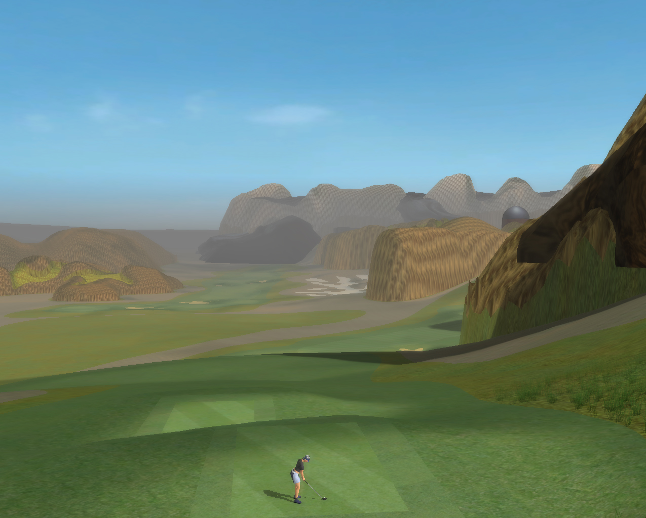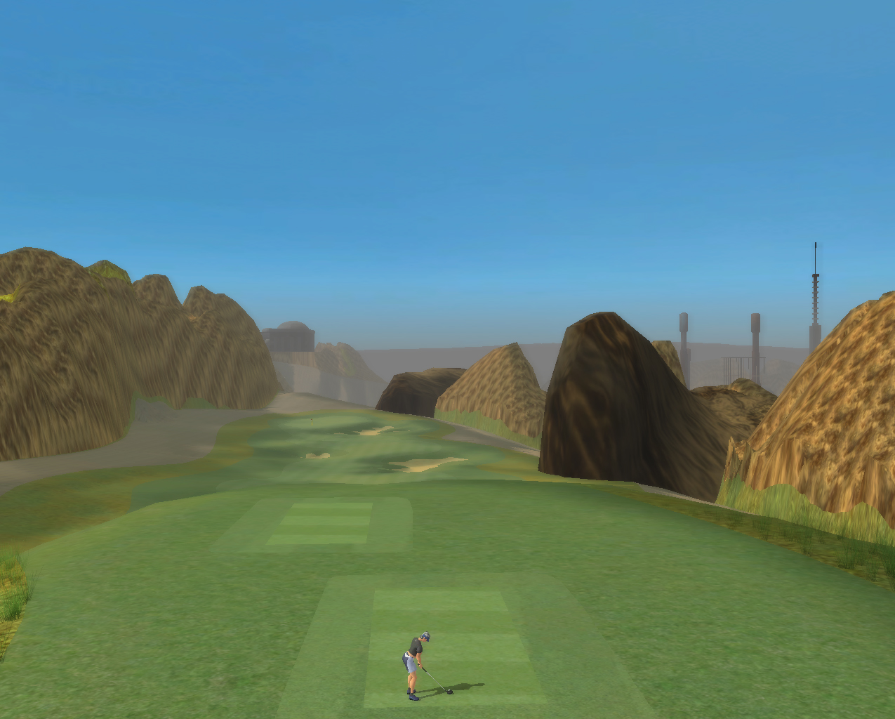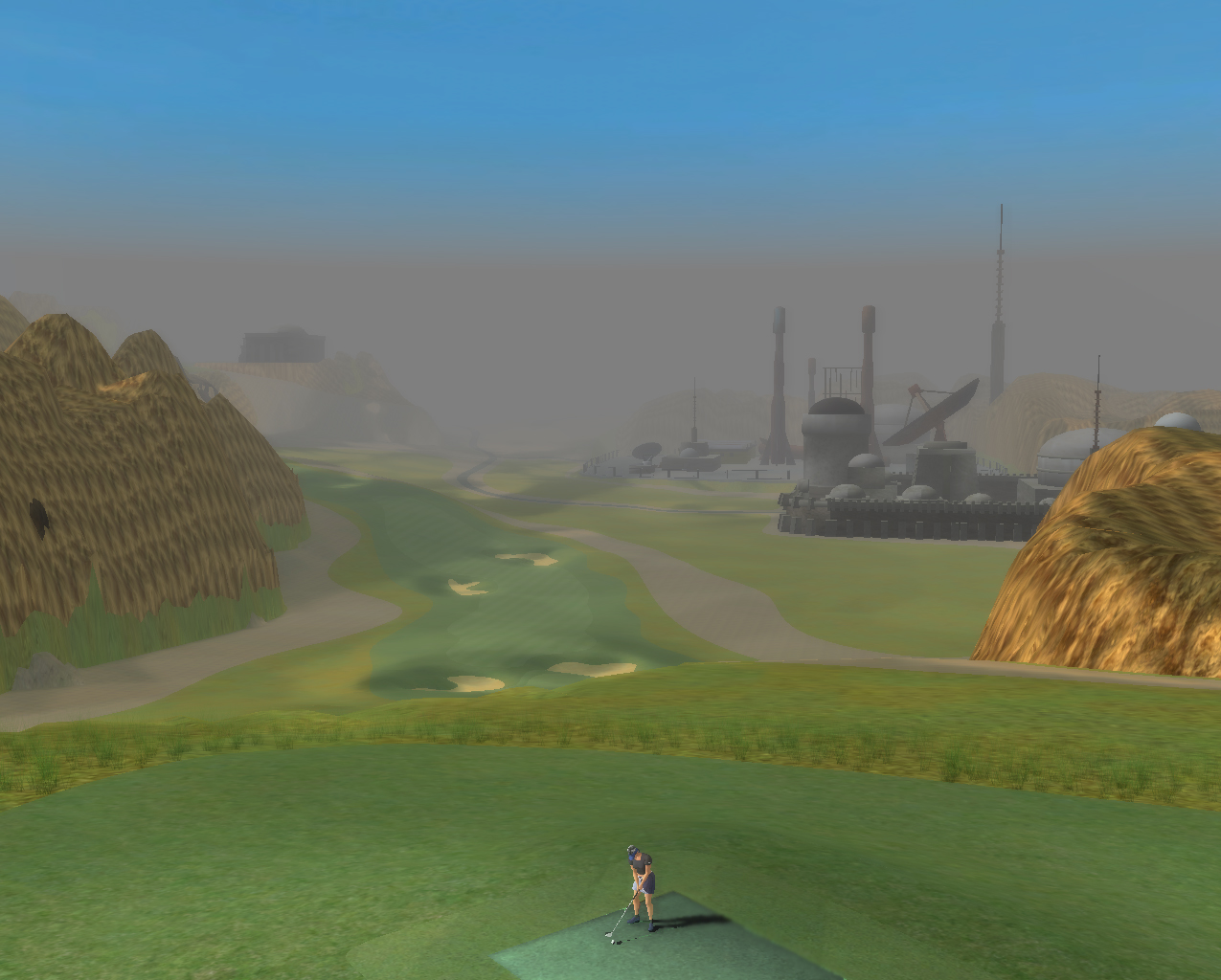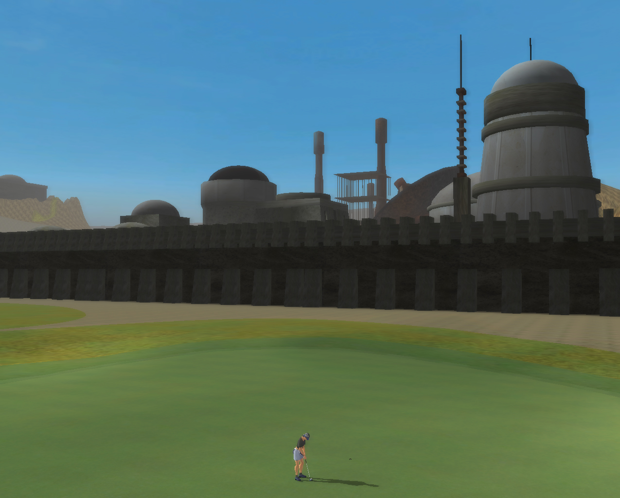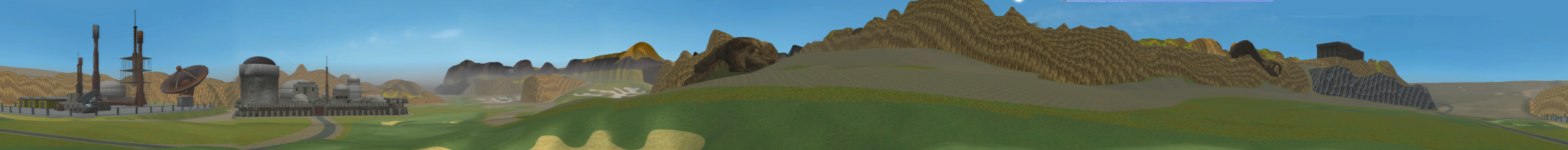 | Heres a panoramic view of the entire course, as seen from the 8th green. The course starts in the hills overlooking the small town of Mos Eisley and its adjacent spaceport and circles down to the plain. |