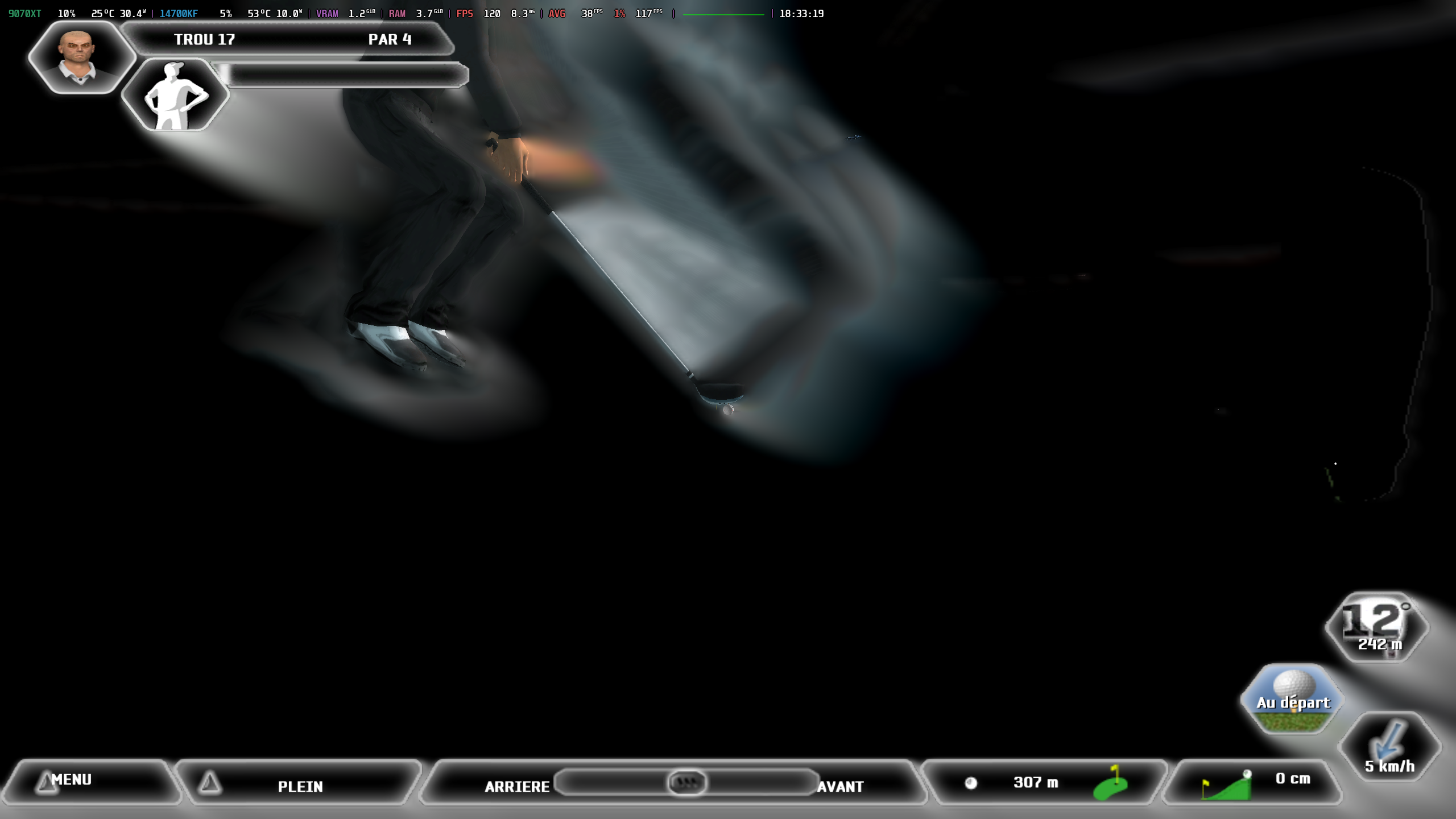 So you are still stuck on hole 17 ? In your video on bottom right side you have an icon with the slope, normally it is a small number ( a few inches ) In your video on hole 17 it gives a downhill or uphill of: 277779840 yards That is a huge number, something wrong there. |