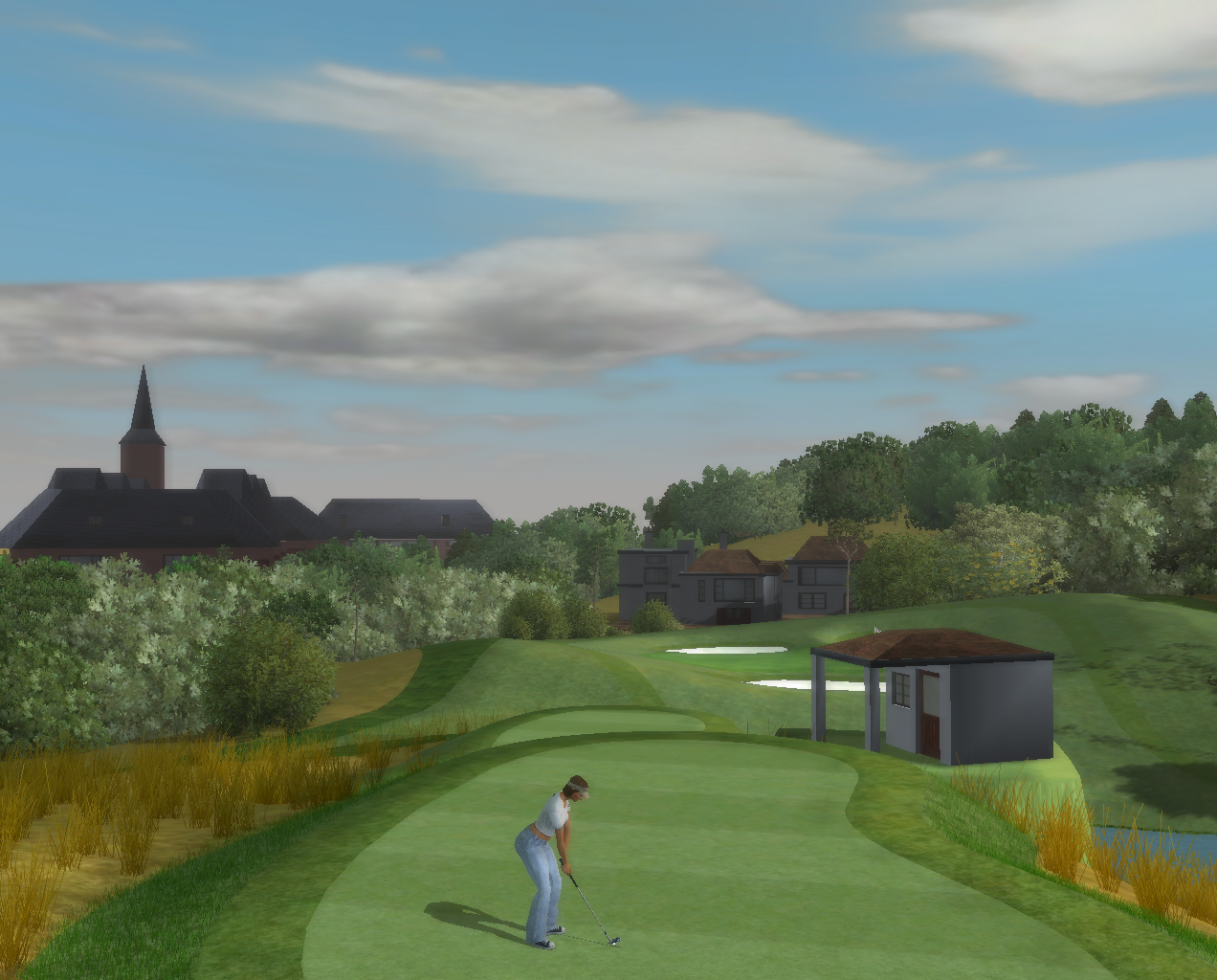 | Homeboy, heres what I came up with for the clubhouse. Not an exact match, that was hard to do from the pix you showed me, but it seems to have the right kind of feel to me. Ill check into these other structures as well. That little structure att he 1st wont be too hard, but the hotel is a different matter lol. |